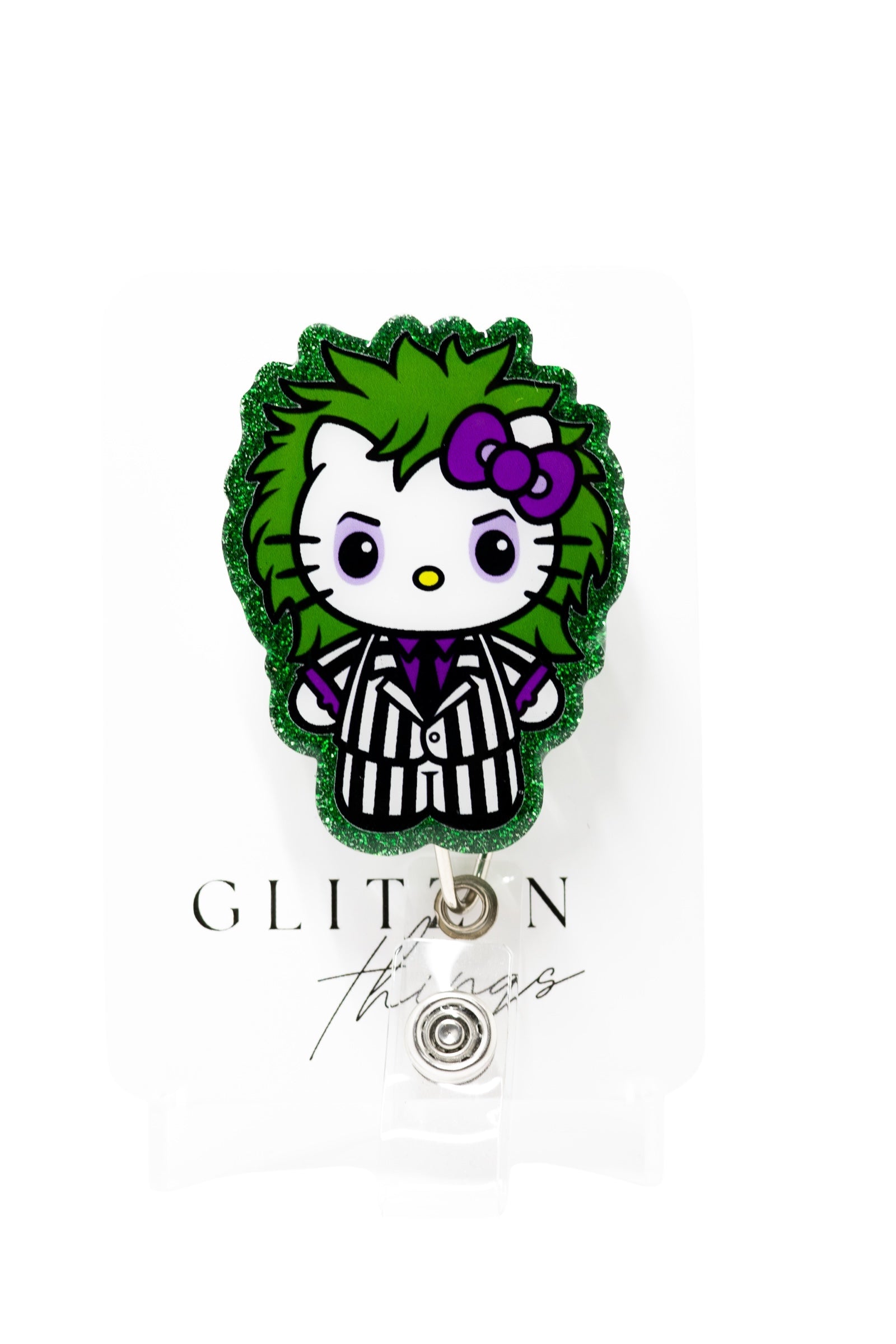 With the Beetlejuice Kitty badge reel, you can add some fun and style to your work day. This reel features the iconic Beetlejuice and Hello Kitty characters, making it a great conversation starter. The sturdy design ensures your ID badge stays secure while also showcasing your love for these classic characters.